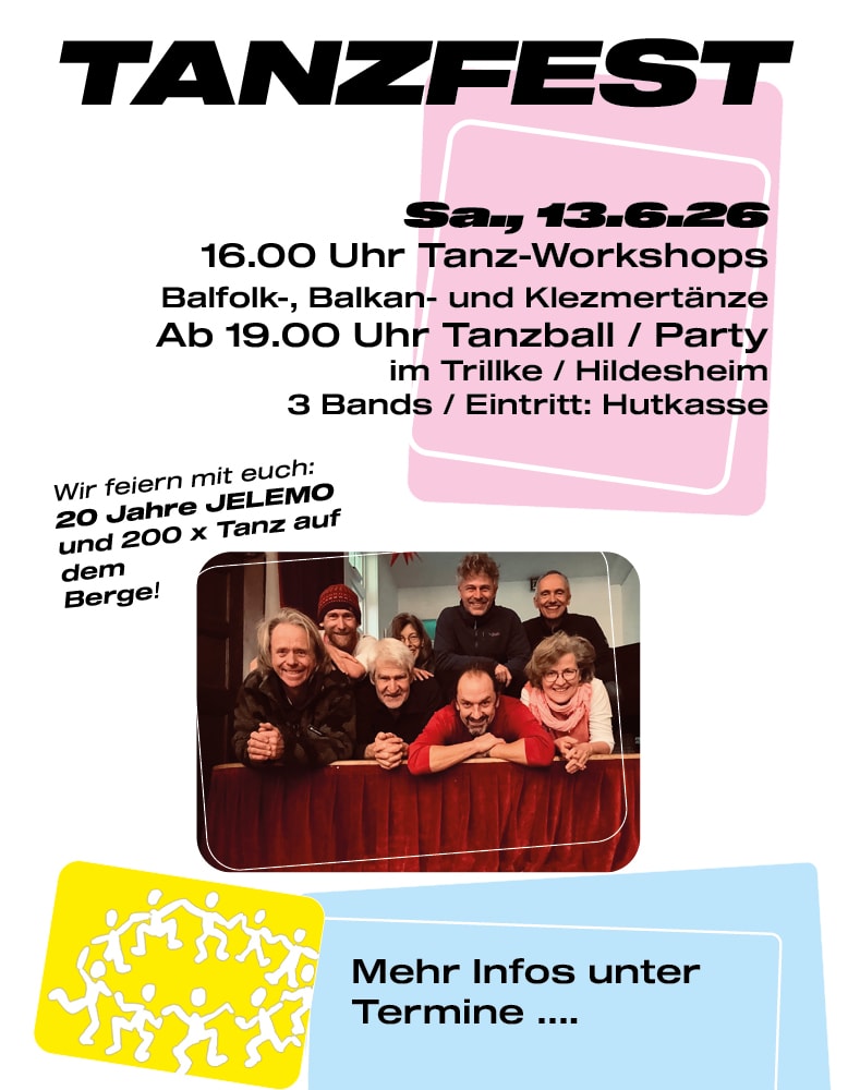 Jelemo, das ist Weltmusik von Russland bis Israel, von Frankreich bis zum Balkan. Mitreißend arrangierte Stücke der traditionellen Folk- und Klezmerszene wechseln sich ab mit einfühlsamen Melodien und schwungvollen Tanzstücken. Die Band aus Hildesheim steckt an mit ihrer eigenen Begeisterung.